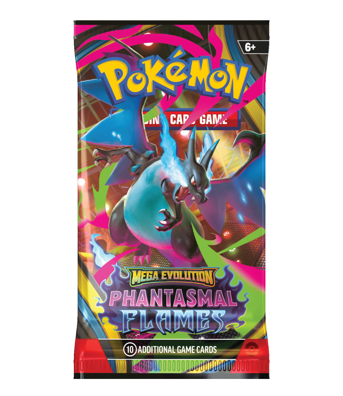 Searing blue flames rip across a dark battlefield as Mega Charizard X ex soars up and looks down upon its opponents! With a deep chill to rival the heat, the shadowy figure of Mega Gengar ex slowly rises into view, and both Pokémon prepare to attack. Determined to prove their mettle, Mega Heracross ex, Mega Lopunny ex, and even more Pokémon line up to give it their all in the Pokémon TCG: Mega Evolution—Phantasmal Flames expansion!